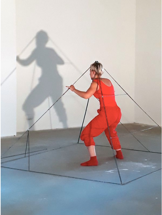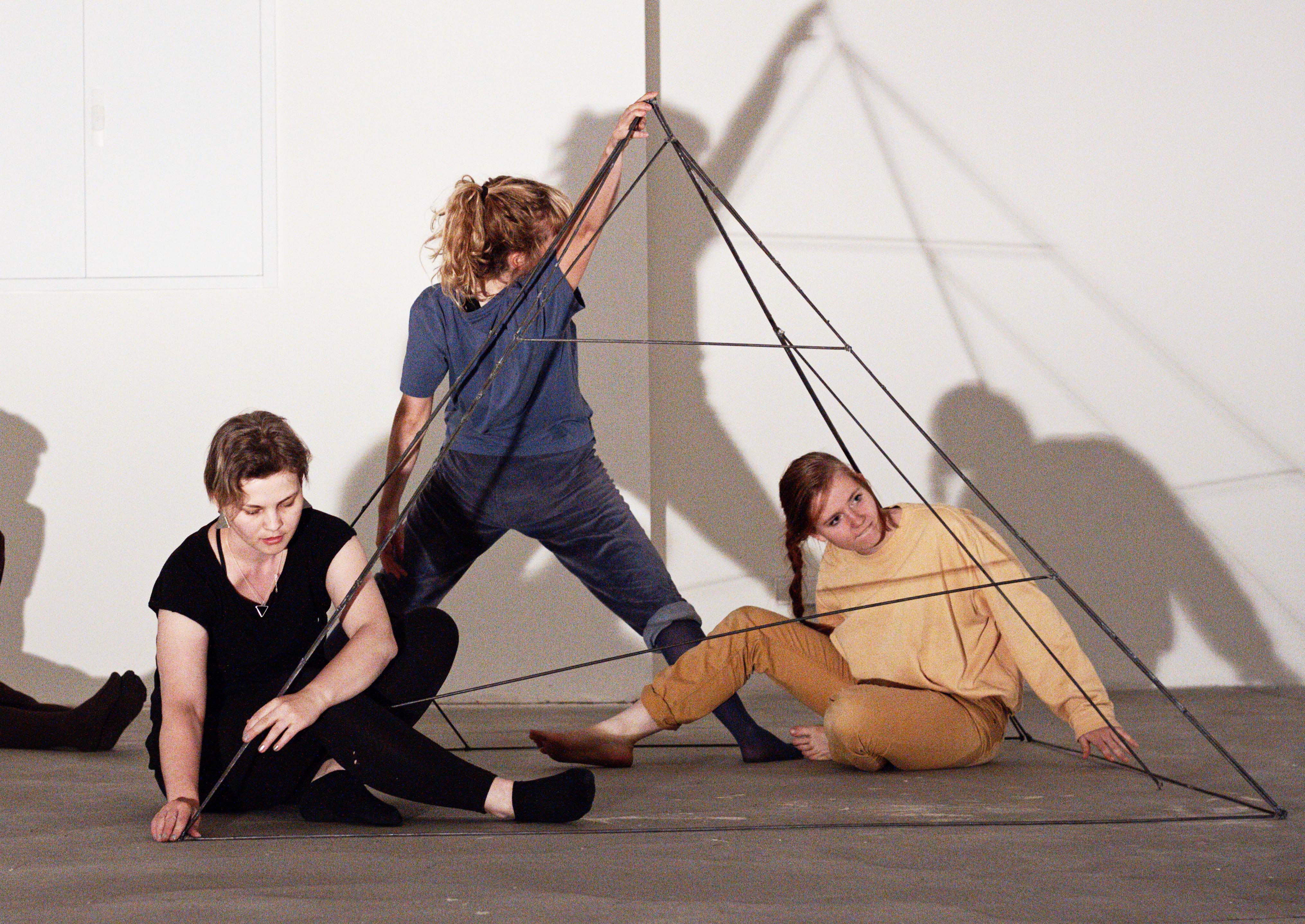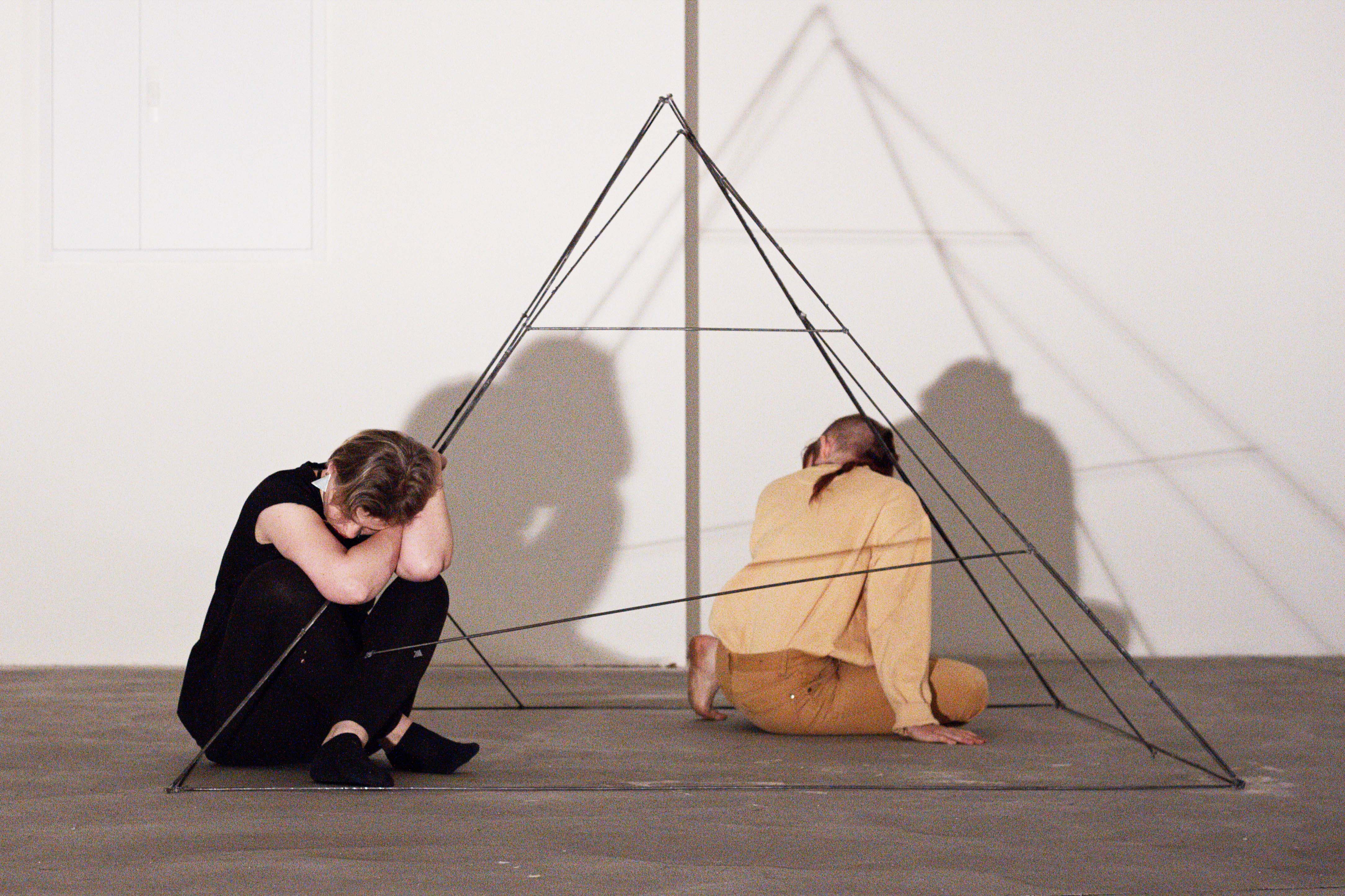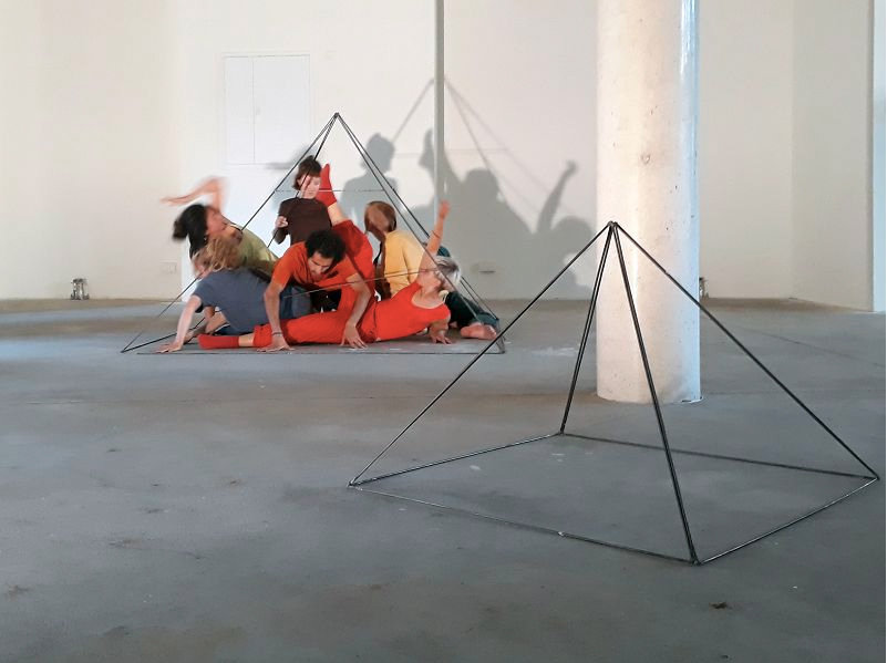 “This performance arose from a painting practice developed by Diana Hanitzsch, in which she works on a square form with seven layers of paint in seven colours. »It was exciting to imagine the paint as moving bodies, each with their own energy. I was curious: How would the layers interact in their pyramidal form? In the final part of the performance the colourful bodies slowly destroy the metal pyramid that held them together. Instead of keeping to its original shape, the metal form now gives way to the body and transforms into individual shapes, which are scattered across the room. In the end, nothing is left following this interplay of formation, transformation and destruction. Nothing confines the body… a bitter freedom.”